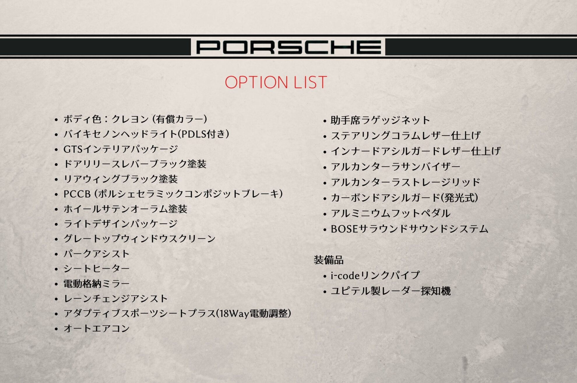 当社グループ店舗”IBILAB."にて、法廷12ヶ月点検および、エンジンオイル、オイルエレメント、ワイパーブレード、エアコンフィルター、キャビンフィルターを交換し、ETCセットアップを行います。ポルシェ最新テスターでの診断も含まれております。 -