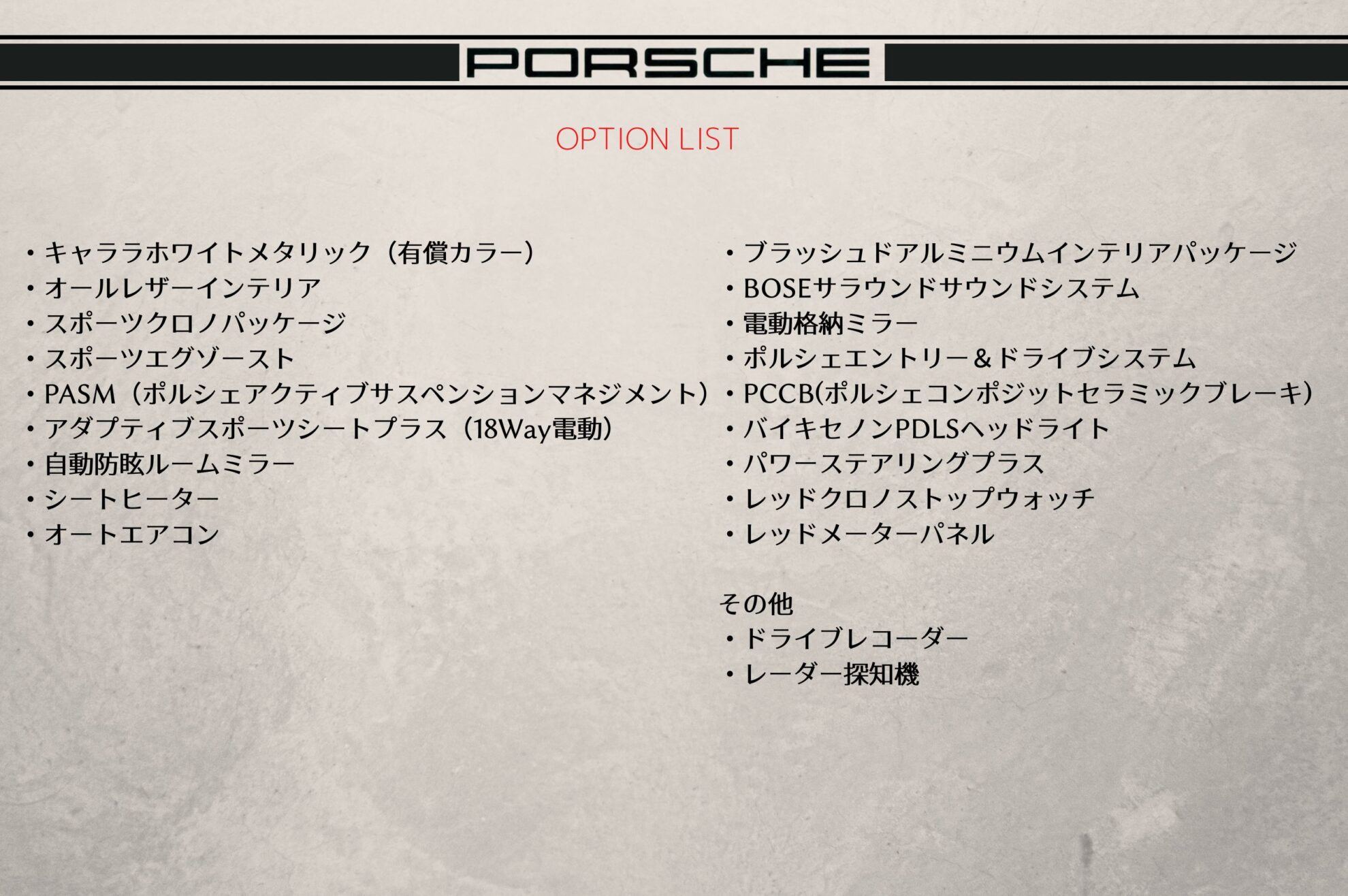 - 特別装備 スポーツクロノPKG PCCB PASM ドラレコ