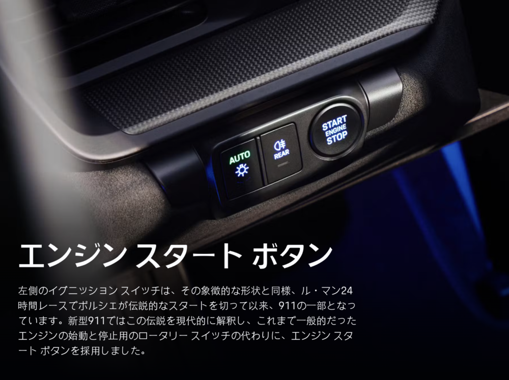 現在の911の最新モデルは992.2(後期)で、今回紹介する992.1(前期)から各部アップデートがされている。しかし、一人のポルシェファンとして少し寂しく感じてしまう部分がいくつかあります。一つはスターターを捻ってエンジンをかける方法からエンジンスタートボタンに変更されたこと。個人的にはあの儀式はポルシェの一つのアイデンティティーで、ポルシェに乗るという特別感を感じるポイントでした。