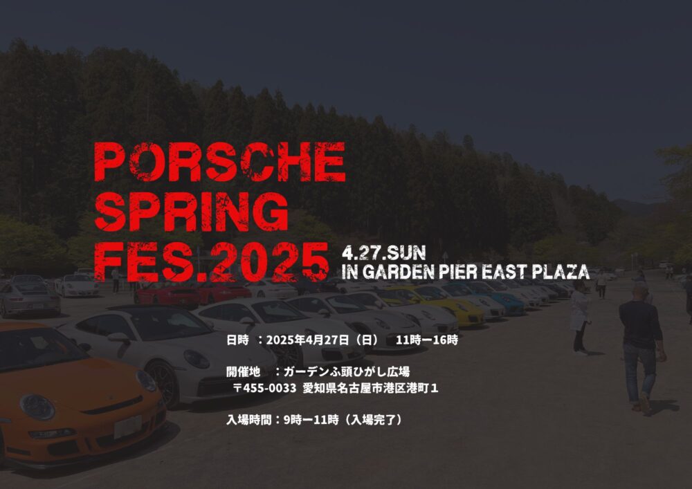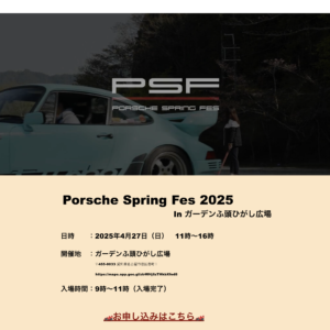 さて、春になりますと毎年恒例のイベント”PSF(Porsche Spring Fes)がやって参ります!今年は東海エリア名古屋に場所を移して、会場のキャパも350台ほどあり、エントリーも続々と集まっておりますので、今年も盛大なポルシェイベントになりそうです!